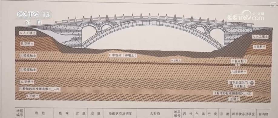 赵州桥全部用石头砌成,下面没有桥墩。如此巨大的石拱桥,基础到底有多大多深?1979年的钻探给出了答案:赵州桥的桥台总厚度仅1.57米,南北长度约5米,是没有做任何加固处理的天然地基。