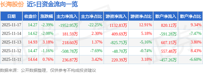 证券之星消息,截至2025年11月17日收盘,长海股份(300196)报收于14.27元,下跌2.39%,换手率2.49%,成交量6.12万手,成交额8776.71万元。