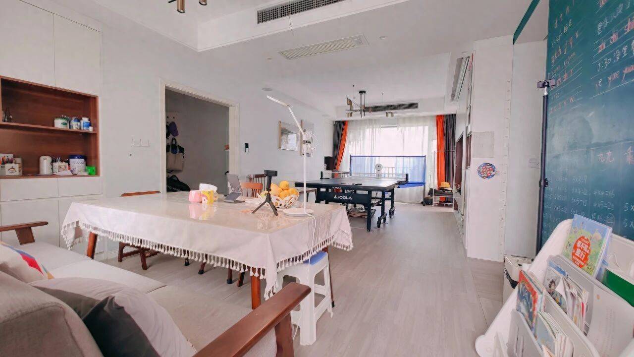 ②私人健身区:客厅中间没茶几时,铺上一张瑜伽垫,客厅秒变健身房,再无障碍物干扰;后来孩子打了,开始学乒乓球了,又可以在客厅中间摆一张球桌,不需为丢茶几而心痛。