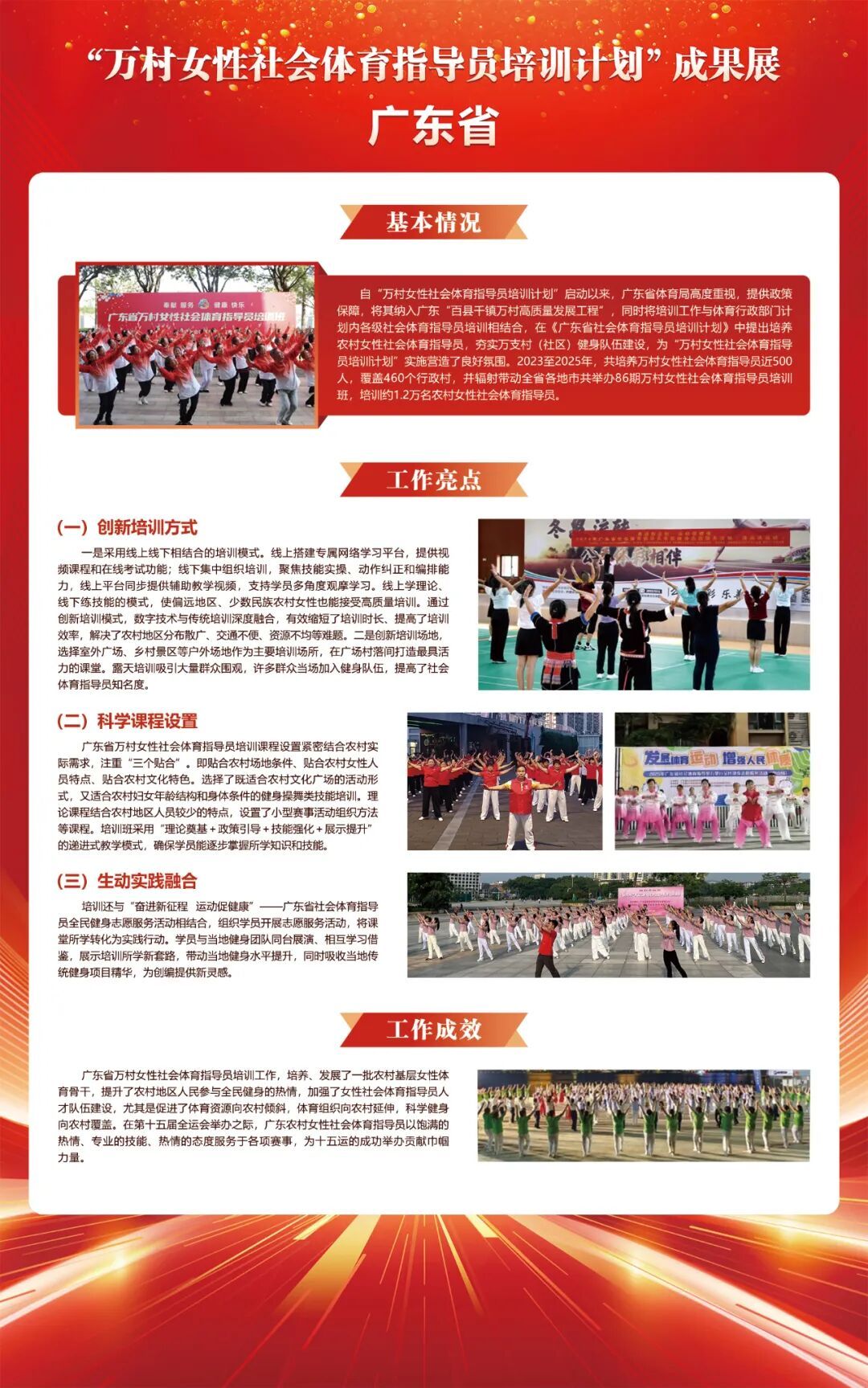 为集中展现“万村女性社会体育指导员培训计划”丰硕成果,宣传推广各地的好经验、好做法,推出“万村女性社会体育指导员培训计划”成果展播,全面展现各地通过实施培训计划推动了全民健身、健康中国和乡村振兴国家战略在农村地区的生动实践,为繁荣乡村文化、建设宜居宜业和美乡村提供了体育方案,夯实了乡村振兴健康根基。
