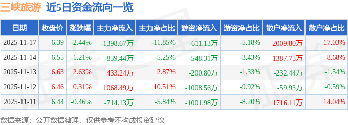 证券之星消息,截至2025年11月17日收盘,三峡旅游(002627)报收于6.39元,下跌2.44%,换手率2.56%,成交量18.35万手,成交额1.18亿元。