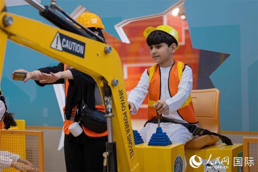 一名儿童在体验挖掘机。人民网 塔里克·易卜拉欣摄